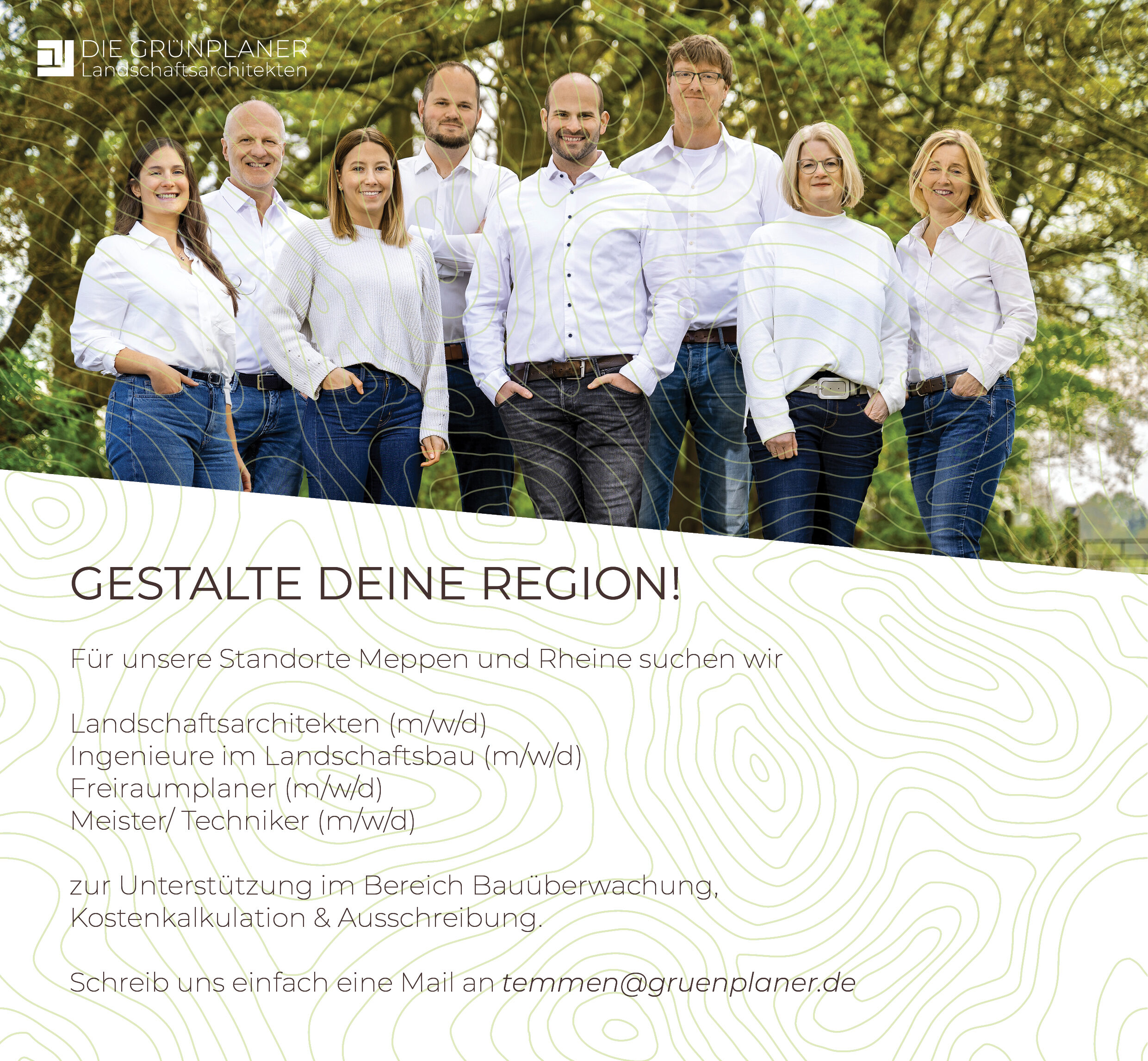 Für unsere Standorte Meppen und Rheine suchen wir Landschaftsarchitekten (m/w/d)Ingenieure im Landschaftsbau (m/w/d)Freiraumplaner (m/w/d)Meister/ Techniker (m/w/d) zur Unterstützung im Bereich Bauüberwachung, Kostenkalkulation,Ausschreibung. Wir bieten dir ein familiäres Team, modernste Arbeitsumgebungen,anspruchsvolle Projekte in der Region und individuelleEntwicklungsmöglichkeiten.Schreib uns einfach eine Mail an temmen@gruenplaner.de